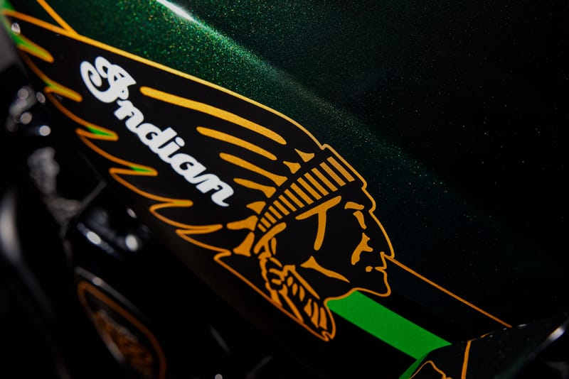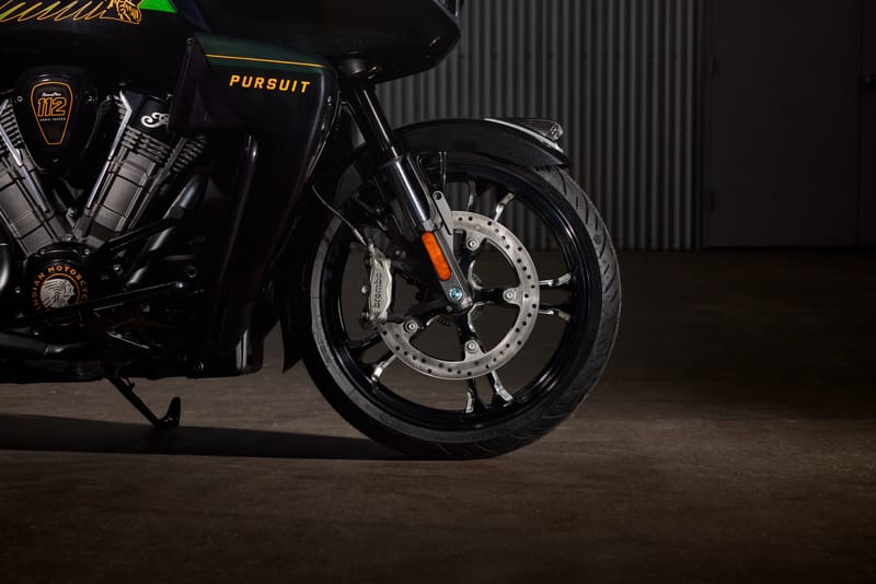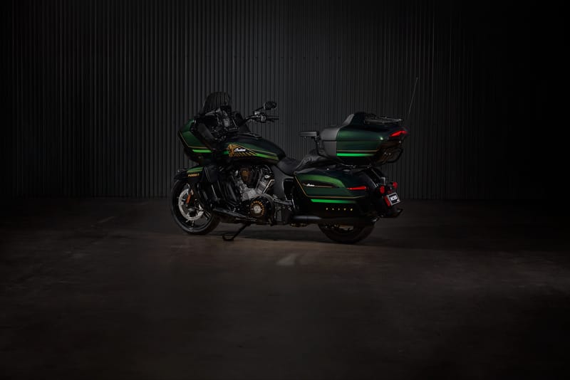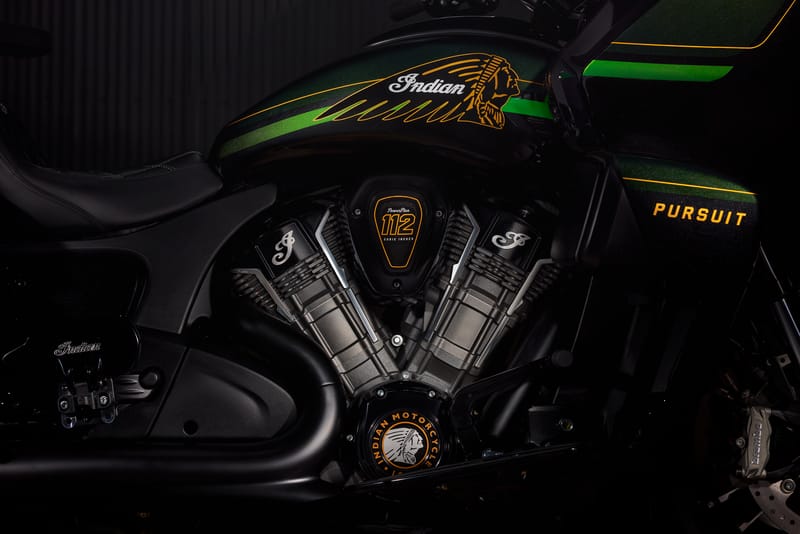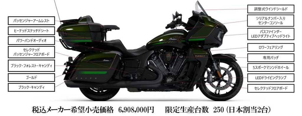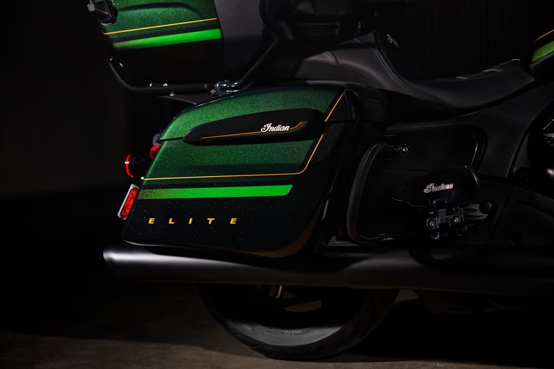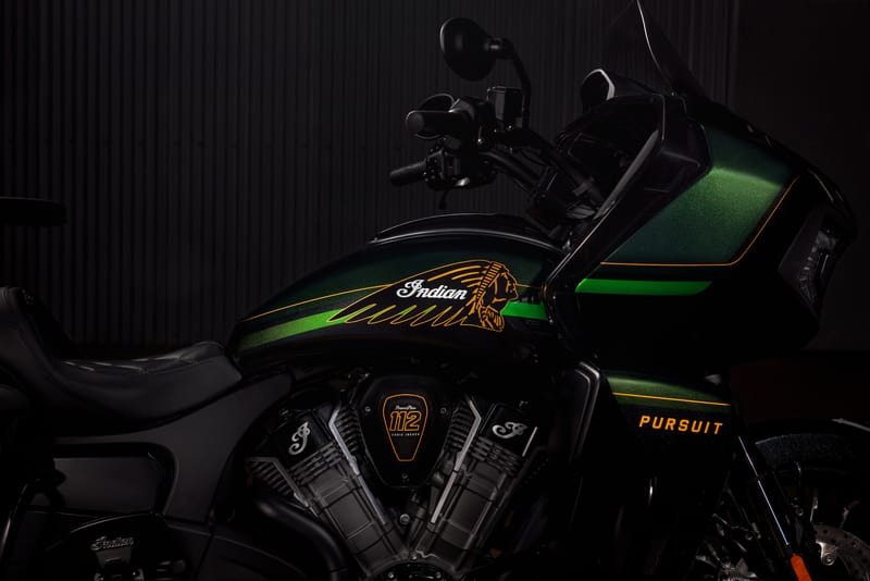 INDIAN PURSUITR ELITE インディアンパースートエリートは、1916年にアメリカ陸軍向けに20,000台のパワープラスエンジン搭載車両を生産した歴史からスタイルのインスピレーションを得ています。この限定版ツーリングバイクは、ブラックキャンディとブラックフォレストキャンディの仕上げが施された3色ペイントを採用し、手描きのチャンピオンシップゴールドのアクセントがその芸術性を高めています。このカスタムペイントは、プレミアムブラックダークホースフィニッシュによってさらに引き立てられており、インディアンパースートエリートに洗練された注目を集めるスタイルを与えています。また、各モデルには、パワープラス112エンジンカバーやシリアルナンバーがあしらわれたセンターコンソールを含むエリート専用のバッジが特徴的に施されています。