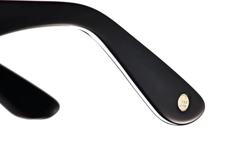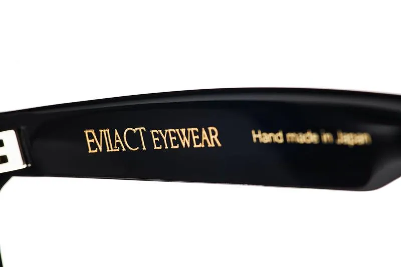 VINTAGE ウェイファーラーをイメージソースに、細部をアレンジしたアウトライン。ブロー部とブリッジに3Dカットを施し、テンプルにEVILACTのエンブレムが埋め込まれたFLANDERS。