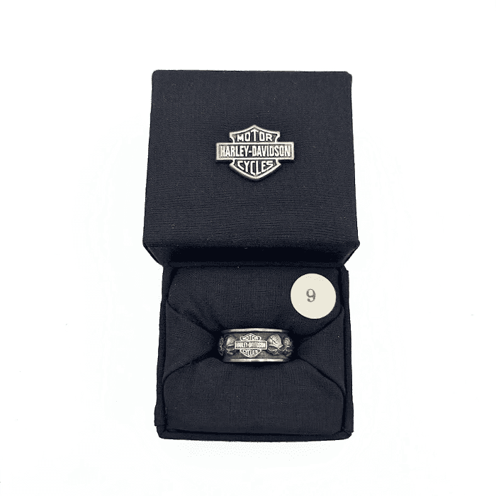 ウィリーGスカル スピナーリングは、925スターリングシルバー製で、幅は1.1cm。ウィリーGスカルとハーレーダビッドソン®のバー&シールドロゴがリングを包み込み、内側にはカリグラフィーでハーレーダビッドソン®の文字が刻まれています。